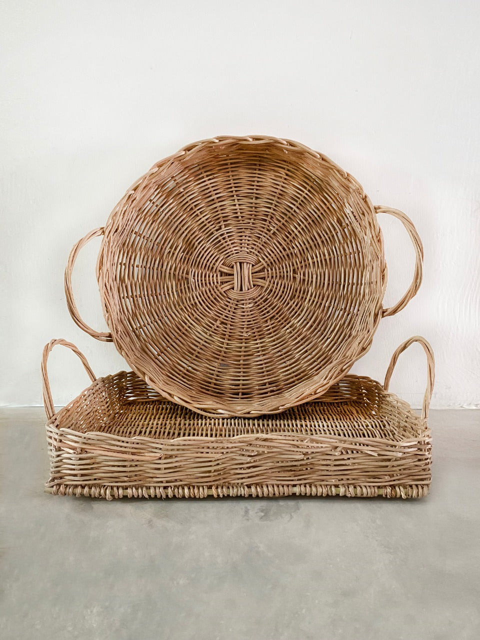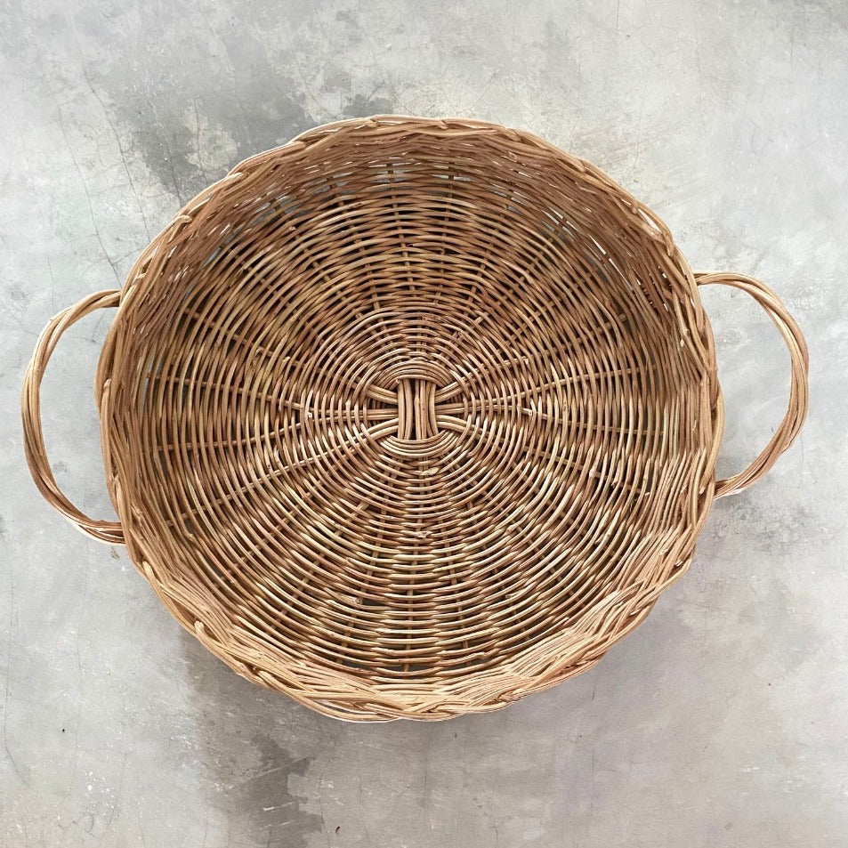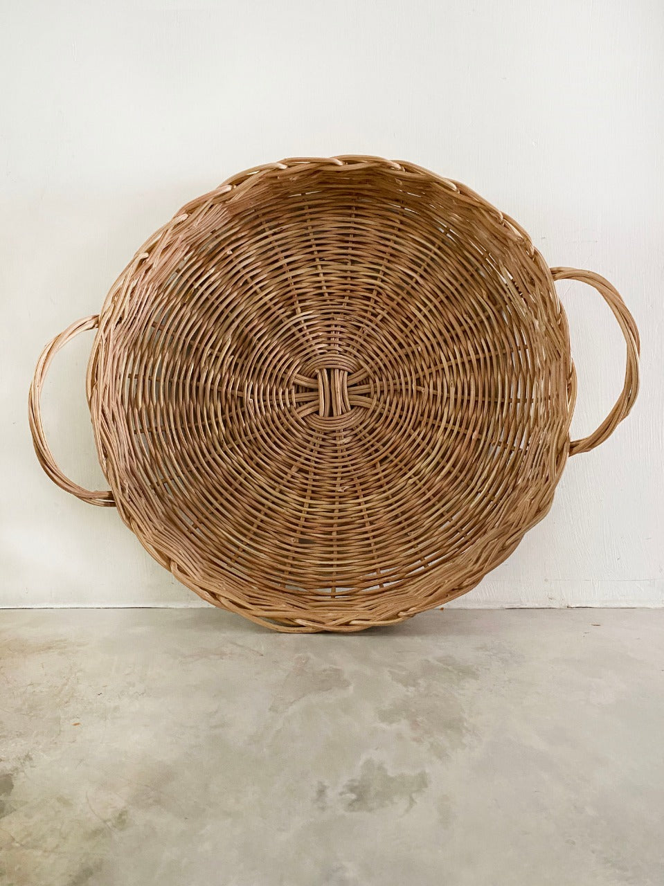 Práctica y hermosa bandeja circular tejida a mano con bejuco. Con bordes y asa en cada extremo. Diámetro 42cm. Alto 7-8cm