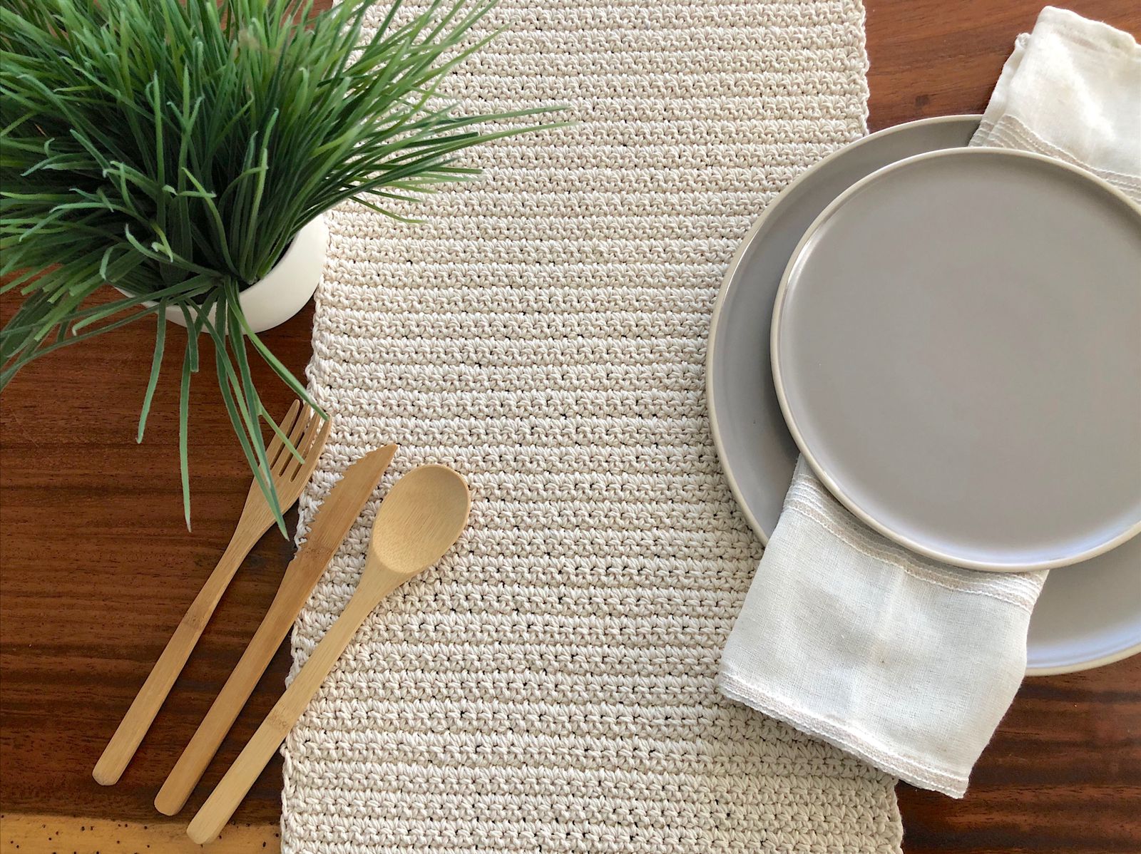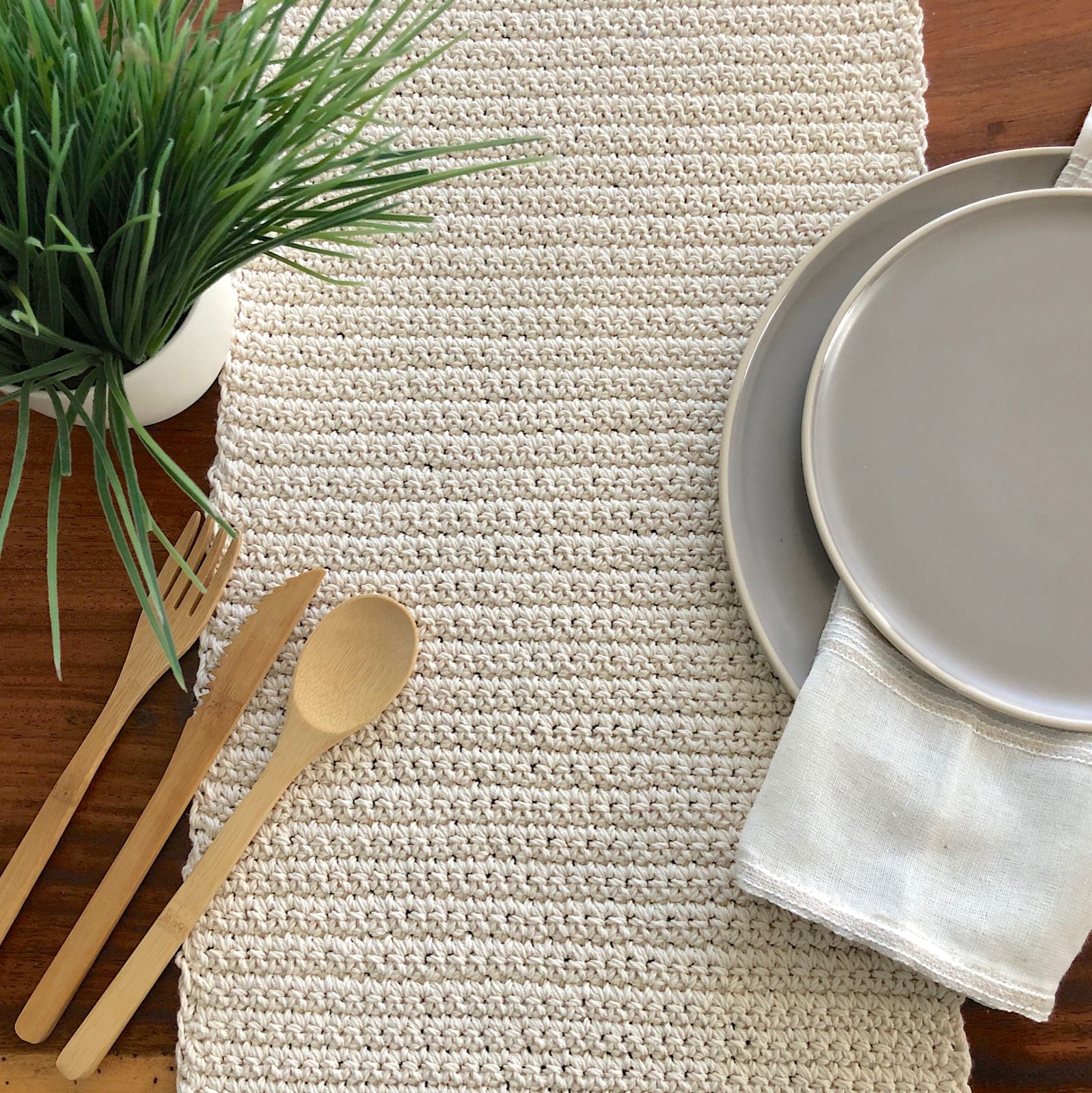 Delicadamente tejido a mano, con algodón natural. Añade un toque rústico y natural a tu decoración de mesa, el detalle perfecto para agregar calidez a tu montaje.